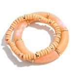 Set of Two Beaded Bracelets Featuring Wood and Acrylic Tube Beads With Metal Disk Accents.