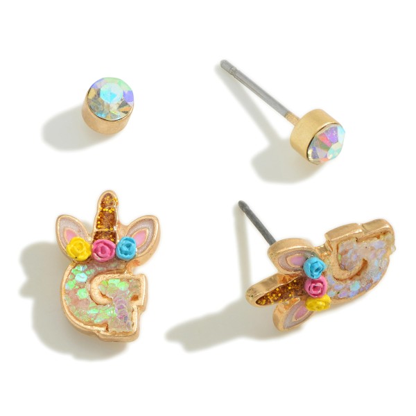 Set of Two Iridescent and Glitter Initial Unicorn Stud Earrings For Kids