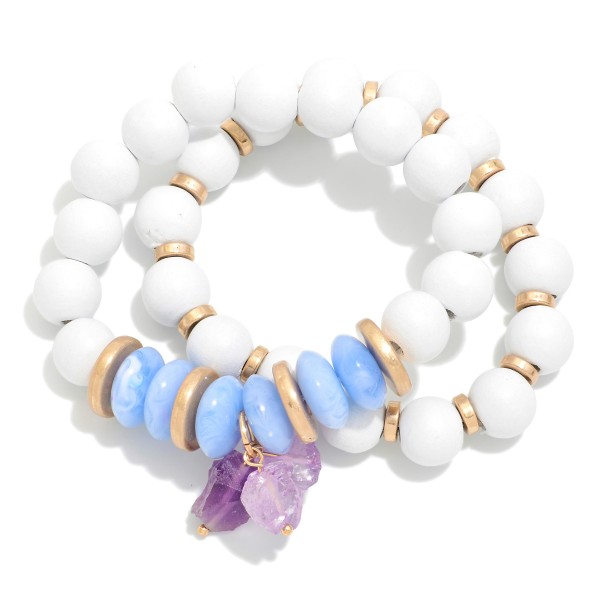 Set of Two Wood Beaded Stretch Bracelets Featuring Natural Stone Disc Beads and Raw Crystal Charms