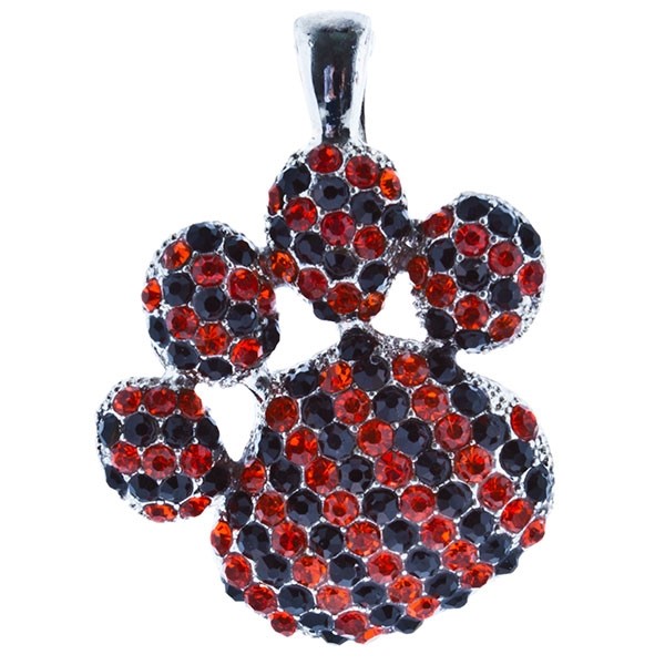 2 1/2" Silver tone paw pendant encrusted with orange and black rhinestones.