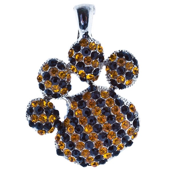 2 1/2" Silver tone paw pendant encrusted with yellow and black rhinestones.