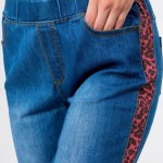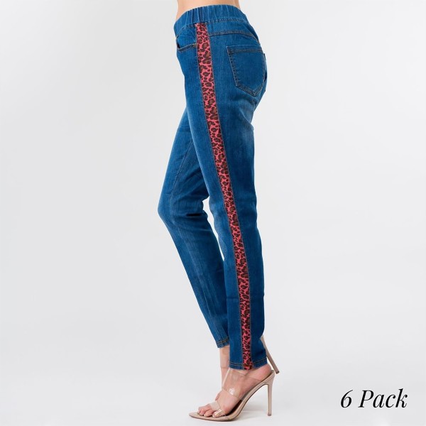 Stretchy denim coral leopard print side stripe jeggings featuring pull on style with front and back pockets.