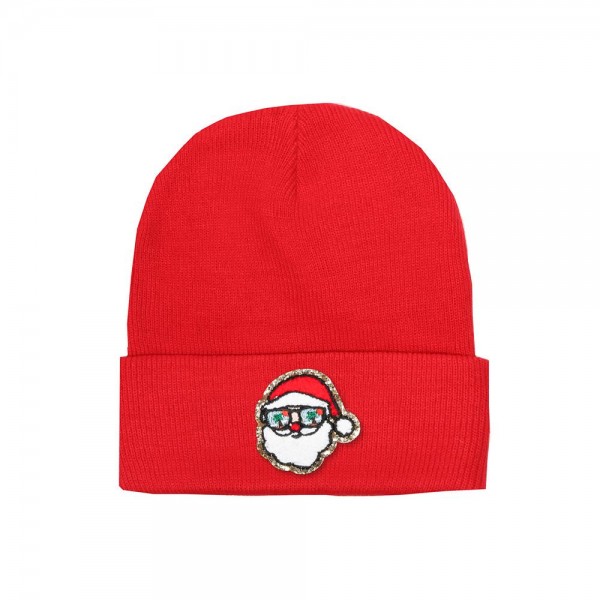 Tropical Santa Glitter Chenille Patch Knit Cuffed Beanie