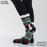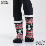 Women's Assorted Christmas Snowman Print Sherpa Socks. (12 Pack)