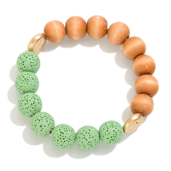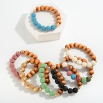 Wood Bead Stretch Bracelet With Lava Stone Inspired Bead Accents
