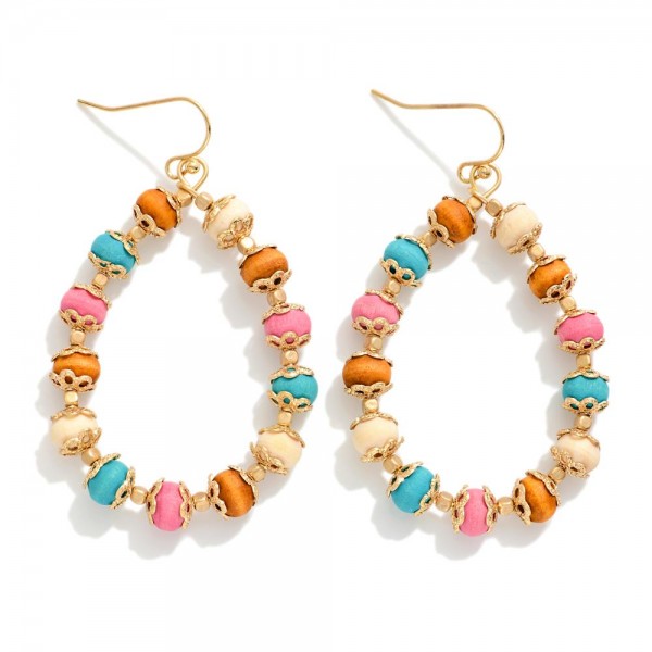 Wood Beaded Teardrop Drop Earrings Featuring Gold Tone Details